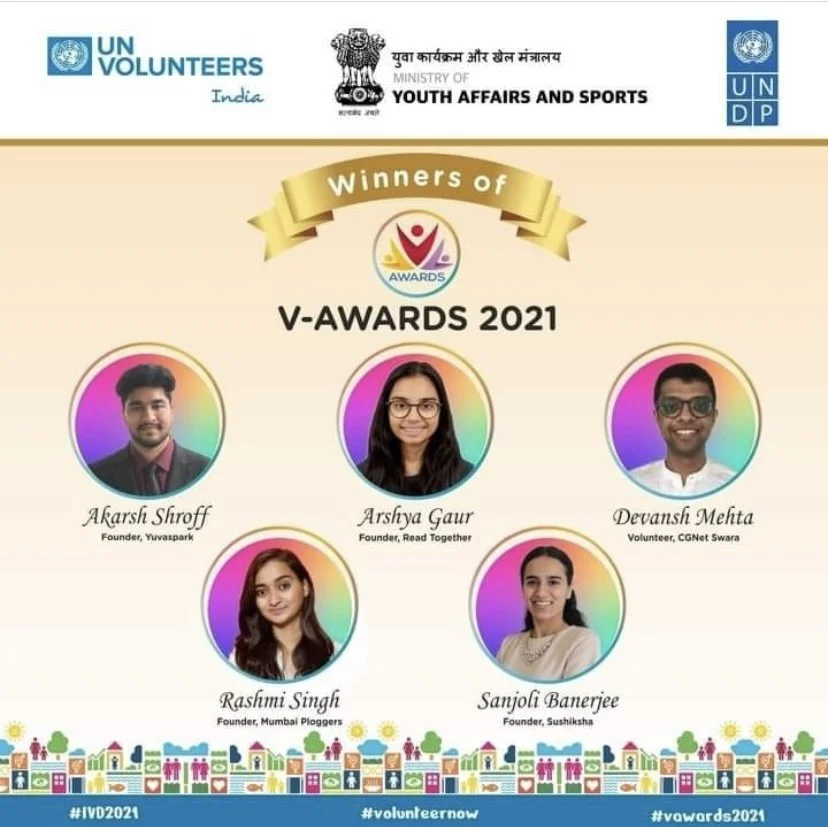 Arshya Gaur (Founder) was recently awarded the United Nations Volunteer Award (V-Award) for her service to the nation through Read Together. The award was presented to 10 recipients across all age groups by the United Nations Development Programme, United Nations Volunteers, and Ministry of Sports and Youth Affairs, India. The award has opened new doors to create a larger impact all over the country. We’re excited to see what the future holds for Read Together!